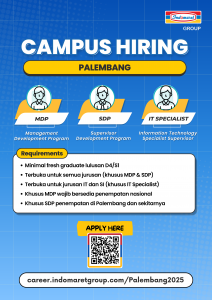 Seiring dengan perkembangan bisnis, maka Indomaret Group melakukan Campus Hiring di Wilayah Palembang bertempat di Universitas Katolik Musi Charitas Palembang yang bertujuan untuk mencari talenta muda yang unggul serta mendapatkan kandidat yang sesuai dengan kebutuhan perusahaan. Campus Hiring ini dilaksanakan pada: