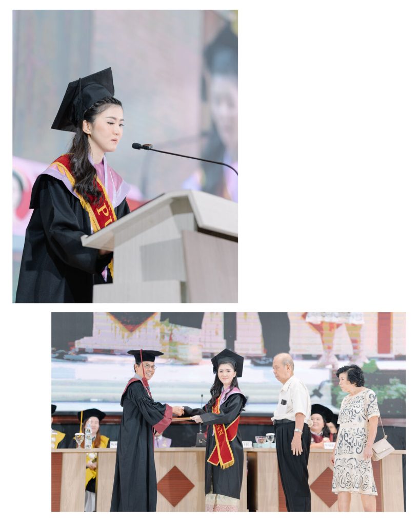 Hellen menyoroti peran sentral para tenaga pendidik di UKMC dalam membentuk karakter lulusan. Menurutnya, kesabaran para Bapak/Ibu/Romo/Suster telah berhasil membentuk mahasiswa menjadi pribadi yang tidak hanya terasah secara akal budi, melainkan juga menjadi sosok yang bermartabat, memiliki cinta kasih, dan unggul. Bekal inilah yang membuat mereka siap untuk terjun ke dalam kehidupan bermasyarakat. “Tak ada satupun dari kami yang dapat memulai dan menyelesaikan proses studi dengan baik tanpa pengetahuan dan bimbingan yang telah diberikan,” tutur Hellen mewakili rekan-rekannya.
