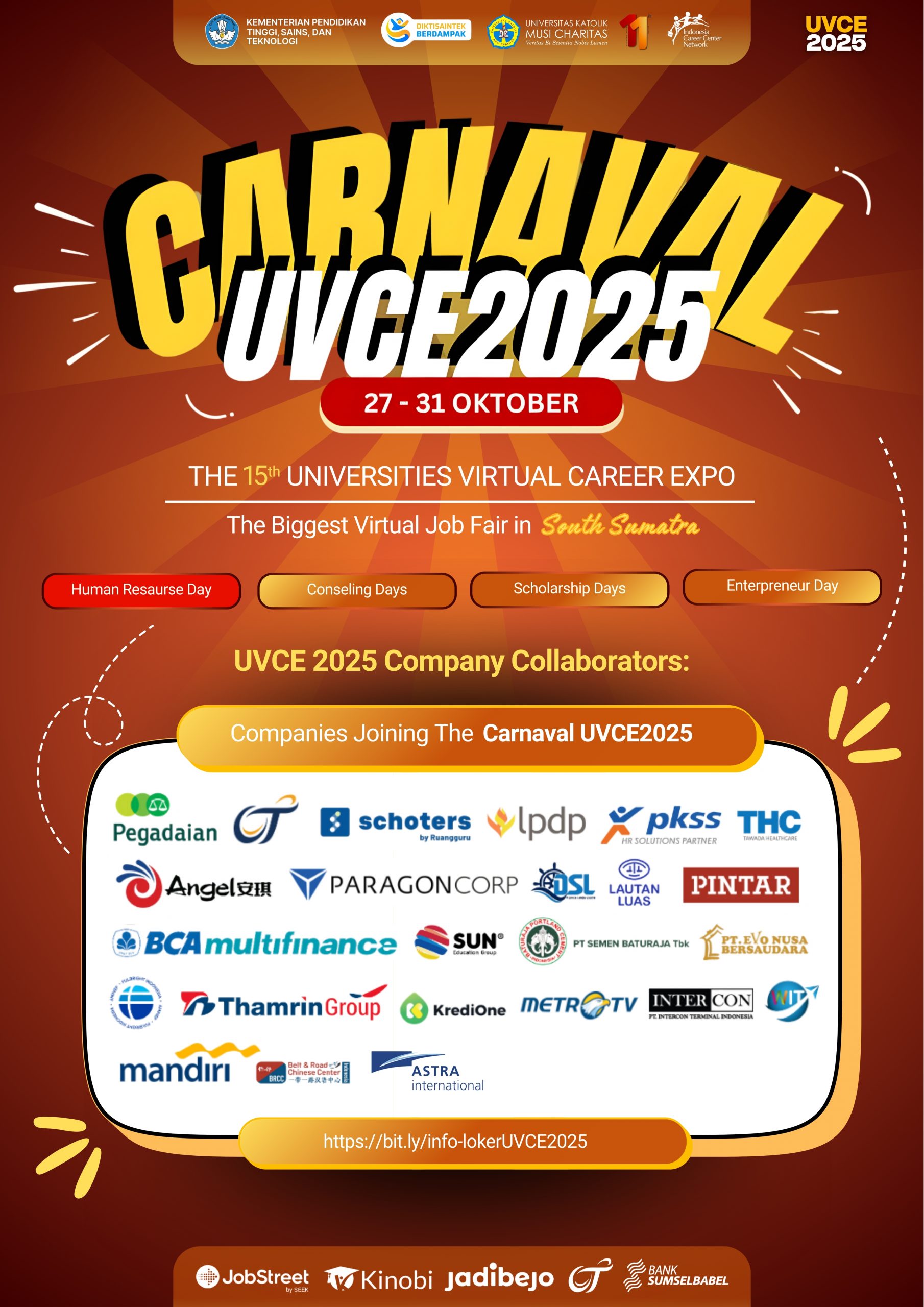 Kegiatan UVCE 2025 ini mendapatkan dukungan dari JobStreet by SEEK, KINOBI, Jadibejo, OT Group, Bank Sumsel Babel