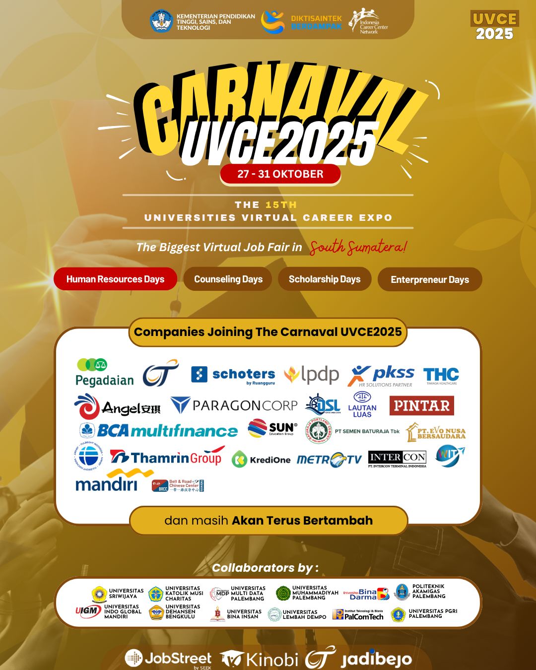 Universities Virtual Career Expo (UVCE) 2025 hadir di Universitas Katolik Musi Charitas (UKMC), sebuah acara yang sangat dinantikan dengan tujuan untuk menjembatani mahasiswa dan alumni dengan dunia pendidikan tinggi dan dunia industri yang inspiratif. Kegiatan ini berkolaborasi antara Perguruan Tinggi LLDIKTI Wilayah II yang akan diselenggarakan pada tanggal 27 – 31 Oktober 2025